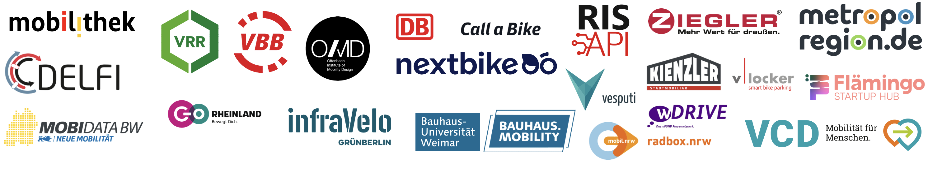 Mit dabei u.a.: Mobilithek, DELFI, RIS::API, VRR, VBB, go.Rheinland, MobiData BW, Freie und Hansestadt Hamburg, Landeshauptstadt Potsdam, Metropolregion Hannover Braunschweig Göttingen Wolfsburg, Bauhaus-Universität Weimar, Professur Verkehrssystemplanung (Bauhaus.Mobility), infraVelo, Call a Bike, nextbike, radbox.nrw, V-Locker, Kienzler, Ziegler, Vesputi, OIMD, Flämingo Startup Hub, wDRIVE, VCD